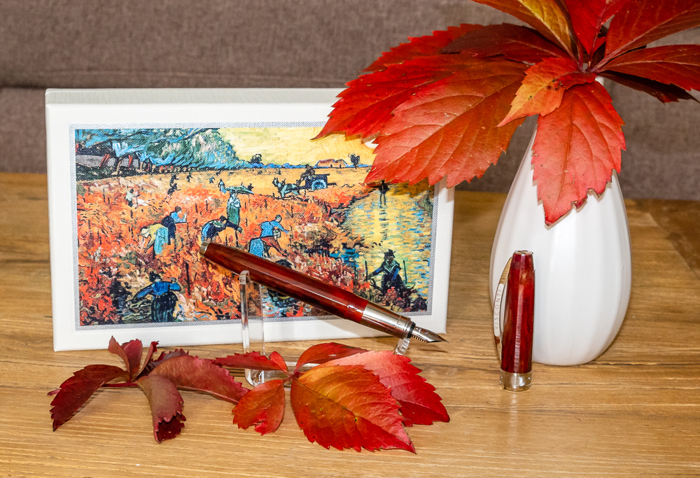 Wieder ein Modell mit sehr warmen Tönen, dieses Mal in tiefem Rot gehalten und mit blauen Farbverläufen. Van Gogh schuf sein Gemälde im Jahre 1888, es zeigt Arbeiter und Arbeiterinnen in Arles zur Zeit der Weinlese. Passend dazu nimmt auch der Füller die warmen Rottöne des leuchtenden Weinlaubs auf; die blauen Farbeinlassungen erinnern an die reifen, dunkelblauen Trauben und an die blaue Arbeitskleidung auf dem Gemälde.