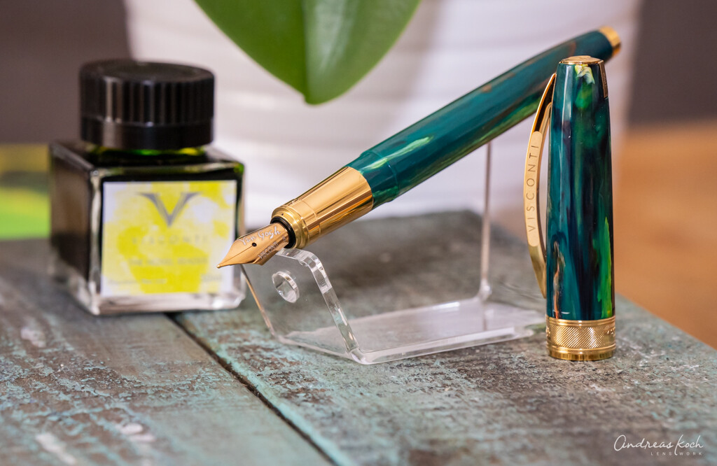 Da das Modell auf der aktuellen Webseite von Visconti nicht mehr aufgeführt wird, scheint es sich um eine frühere Version zu handeln, die nicht mehr produziert wird. Mein Modell hat dementsprechend noch die ältere, etwas größere Feder mit dem ursprünglichen Visconti-Design. Das etwas verspielte Dekor der Feder passt gut zum Gesamteindruck dieses Modells.