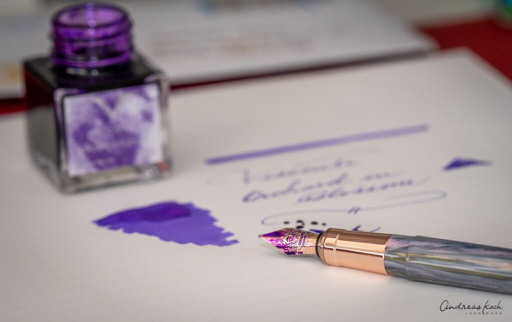 Ich hatte zeitgleich noch einen weiteren Visconti aus der Van-Gogh-Reihe bekommen, ebenfalls mit einer B-Feder und einer speziellen Tinte (Vorstellung folgt noch) - da gab es überhaupt keine Probleme beim Erstdip oder nachfolgendem Schreiben. Klar und deutlich. Daher meine Vermutung, dass es irgendwie mit der Tinte zusammenhängen muss.