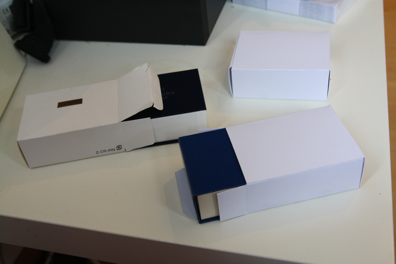 Drei weiße Pappschachteln... links ist das gekaufte Original zu sehen (mit einem kleinen Fenster, durch das man einen japanischen Schriftzug auf dem Schatullendeckel sehen kann), rechts meine beiden Nachbauten.