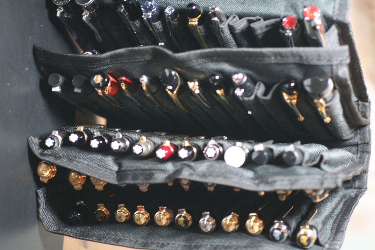 Die Steckplätze selbst fallen erstaunlich unterschiedlich aus. Sicher ist, dass die jeweils äußeren Röhren jeder Lage geräumiger sind, da ist dann auch Platz für Montblanc 149, Conway Stewart Churchill, Laban Mento und ähnlich "dicke Brummer". Ansonsten gilt: Wenn ein etwas dickerer Füller mal nicht passen will, steckt man ihn einen Platz weiter, da geht's dann meist, und für den freien Platz findet sich ein dünnerer.