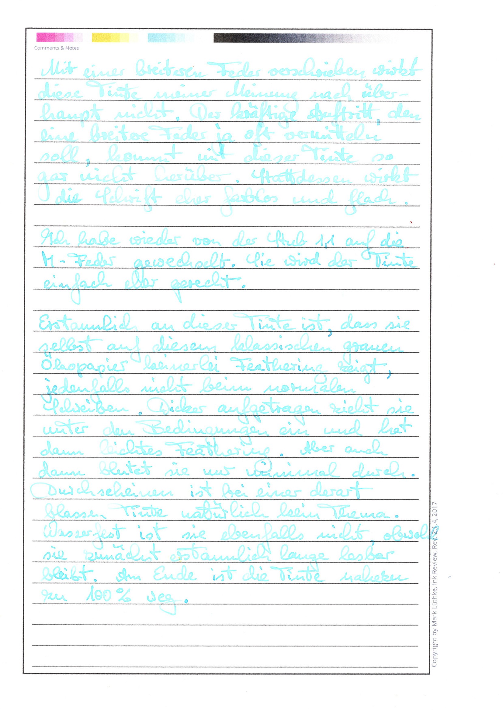Beim Schreiben mit der Tinte hatte ich darüber hinaus den Eindruck, als läge über der Tinte ein silbriger Schleier. Die Tinte hat weder Sheen noch Schimmer aber insbesondere im nassen Zustand, aber auch getrocknet wirkt die Tinte bei bestimmten Lichtverhältnissen so. Das mag auch daran liegen, dass ich es recht anstrengend finde, mit einer so hellen Tinte zu schreiben, die zudem noch relativ lange nass bleibt und so auch lange das Licht der Schreibtischleuchte teilweise spiegelt. Wer aber genau sowas sucht, zum Beispiel auch zum Malen oder Zeichnen, wird sicher seine Freude mit der Tinte haben.