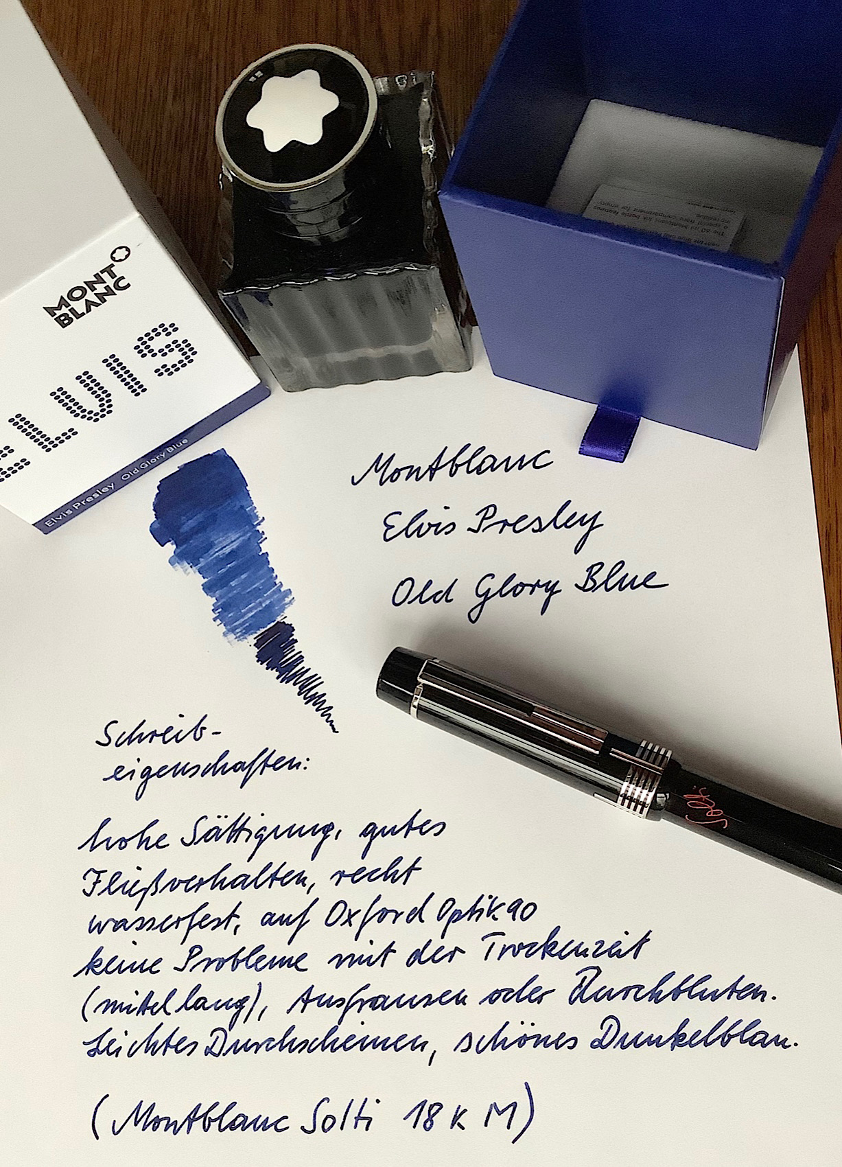 Montblanc hat immer mal wieder limitierte Tinten Musikern gewidmet, so auch dem King of Rock n Roll, mit der ausgesprochen schönen dunkelblauen „Elvis Presley Old Glory Blue“. Da ich nicht auf den gleichnamigen Füller zurückgreifen kann, muss der Montblanc Solti aushelfen. (Der in meiner Plattensammlung ohnehin stärker vertreten ist, Stichwort „Ring“).
