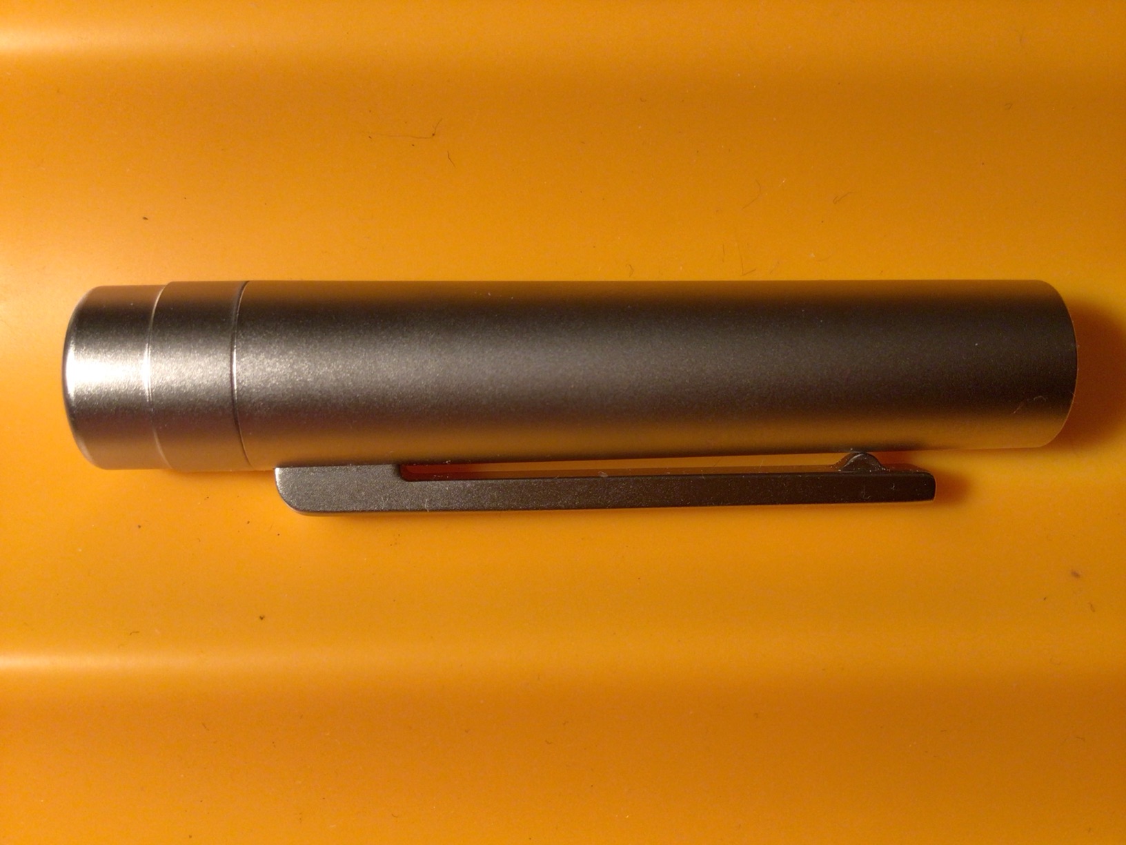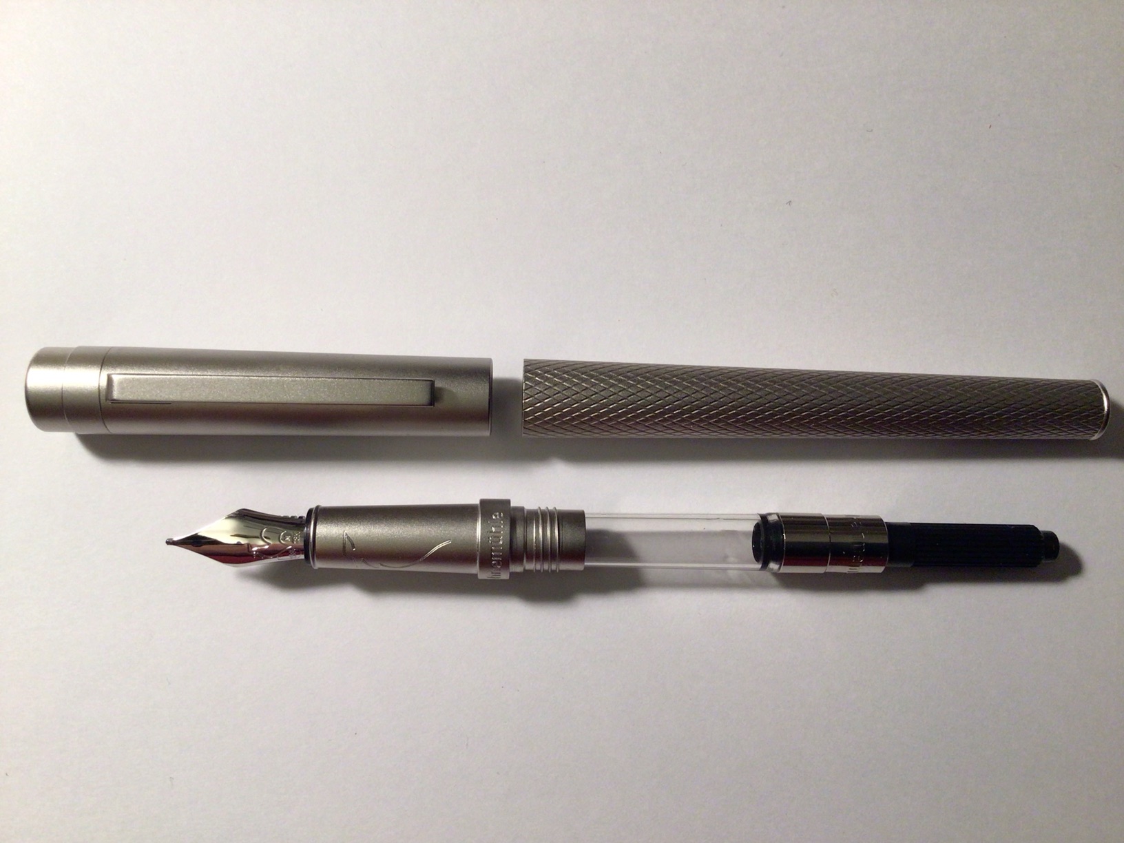 Der Hahnemühle Slim-Edition ist ein vergleichsweise dünner, sich vom Kopf bis zum Ende in gerader Linie verjüngender Vollmetall-Füller. Der Körper besteht aus eloxiertem Aluminium, die Kappe und das Griffstück aus rhodiniertem Messing (vermute ich). Gefüllt wird er mit SI-Patronen (1 lang oder 2 kurz) oder Konverter. Die Kappe ist als Klick-Kappe (Snapcap) ausgeführt. Am unteren Ende aufgesteckt, verriegelt sie an der, als leicht erhabener Ring ausgeführten, Endkappe und sitzt dann sehr sicher.