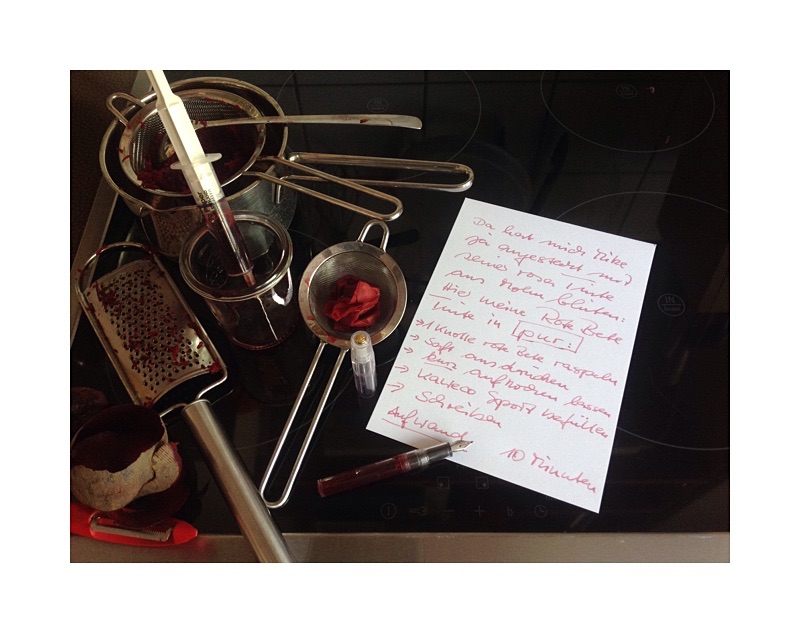 Da musste ich doch mal eben meine Rote Bete aus dem Kühlschrank holen und dieses Mal den Saft pur als Tinte nutzen. Meine letzte Rotebetetinte bestand ja aus dem gefärbten Wasserdampfsaft der Knollenscheiben.